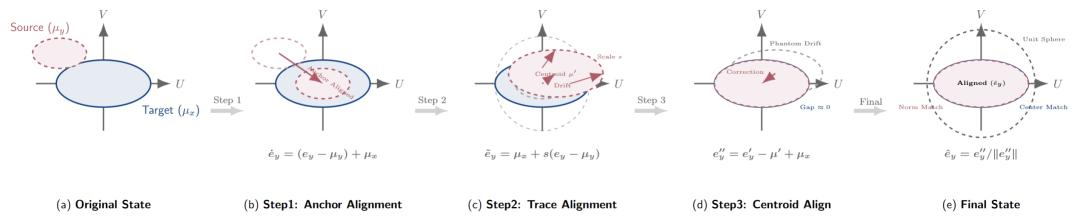 这一步确保了文本特征在保留自身语义结构的同时,在几何尺度和形状上完美复刻了视觉特征的各向异性残差。