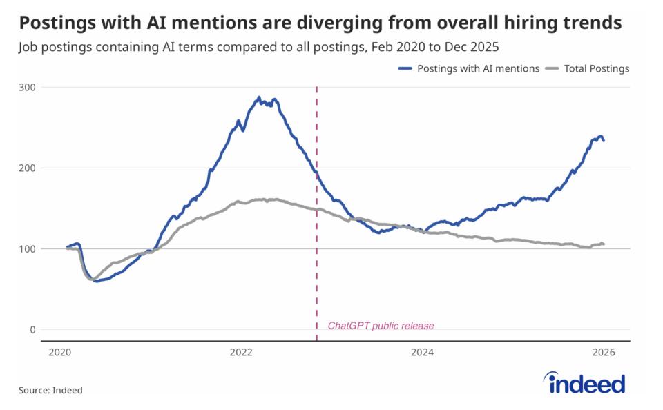 Indeed和Revelio Labs的数据显示,岗位名称没有消失,但HR写在招聘广告里的「岗位职责(JD)」被重写了。 在财务、文书、初级代码岗位中,「日常对账」、「生成标准代码」等容易被AI取代的任务占比正在直线下降;取而代之的是,企业要求应聘者具备「复杂性管理」、「AI系统引导」、「边缘案例解决」和「质量验证与判断」的能力。