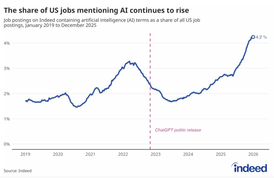 首先,在这个转型中,得利最多的是AI使用者。截至2025年底至2026年初,纯粹的「AI技能岗位」在整体招聘市场中占比依然不高,大约在4.2%左右。 但它的增速是极其恐怖的,生成式AI相关岗位的提及率相比2023年增长了3倍以上。