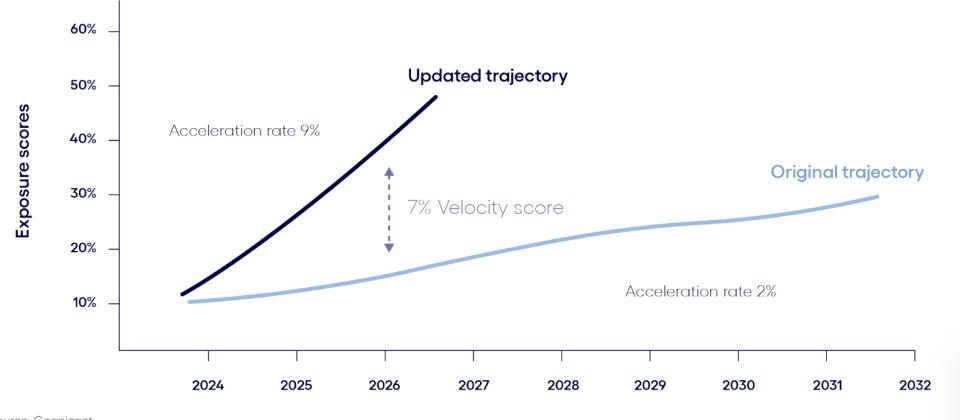 Cognizant用了一个指标叫「速率得分」(Velocity Score),说白了就是你的职业被AI吃掉的速度有多快。