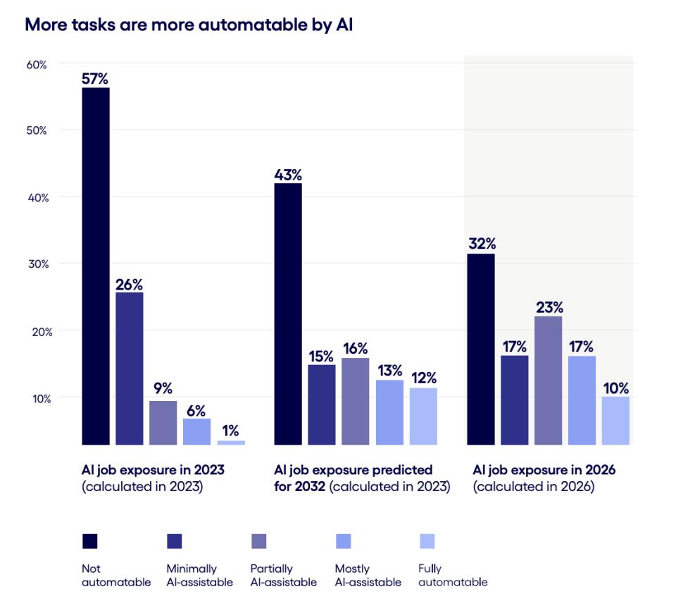具体到岗位上,任务暴露度超过50%的岗位比例从2023年的0%飙升至30%(原预测2032年仅为15%),而所有任务至少暴露25%的岗位则增长了17%,达到69%。