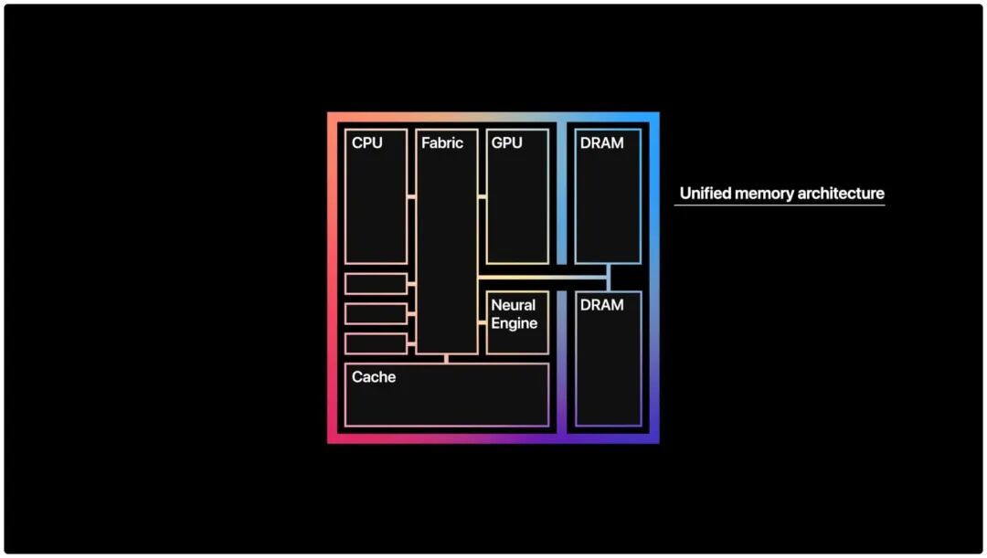 简单来说,统一内存架构的效果,是 CPU、GPU、神经计算引擎能够共享同一个内存池,不再有物理总线搬运的损耗,让 Mac 可以获得极高的内存带宽,并且对于多机串联的扩展性能更好。
