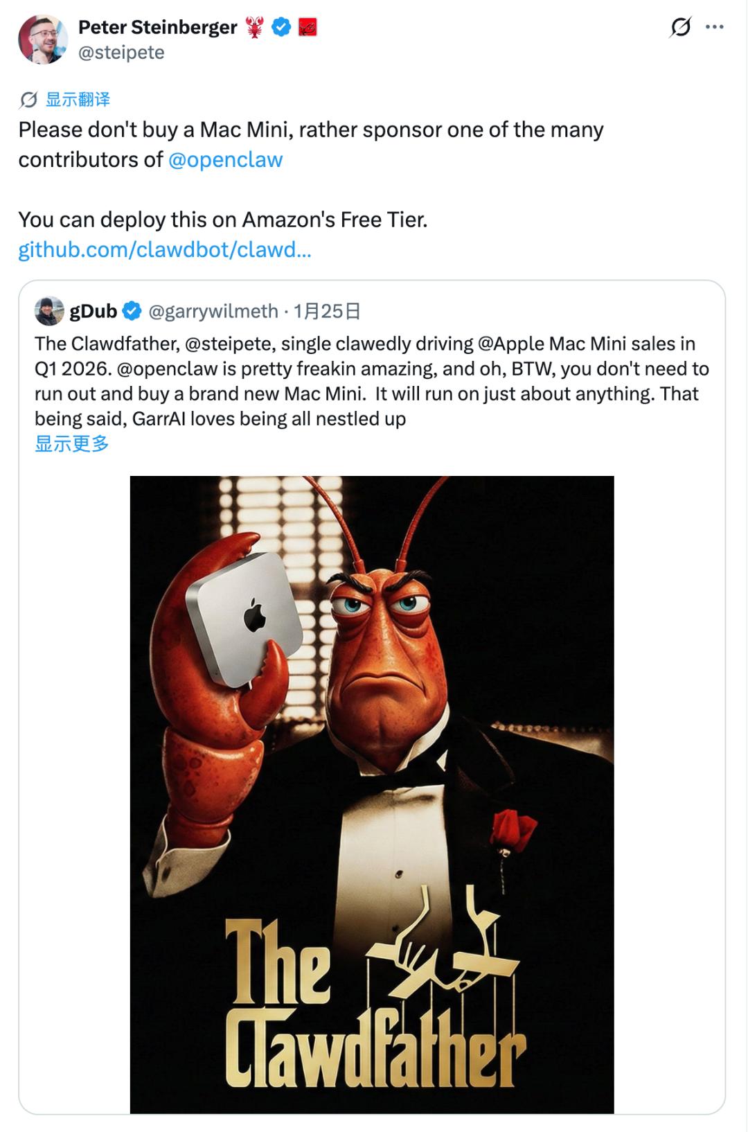 再回到 OpenClaw:它的创造者 Peter Steinberger 曾经公开表示,自己很喜欢 Windows,觉得它的功能更强。他在 Lex Fridman 播客中说,Mac mini 不是唯一的「肉身」选择,通过 WSL2 方式运行 OpenClaw 已经非常成熟了;他甚至公开吐槽苹果在 AI 领域「搞砸了」,并且对苹果生态的封闭性感到不满。