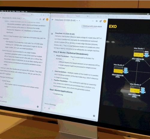 团队为这个 Mac 集群开发了调度平台 Exo V2,可以同时加载 2 个 DeepSeek 模型(V3+R1,8-bit 量化)。不但两个模型并行推理,研究人员甚至可以通过 QLoRA 技术来做一些本地微调工作,显著缩短了训练任务的用时。整套系统功耗控制在 400W 以内,运行时同样几乎没有风扇噪音。