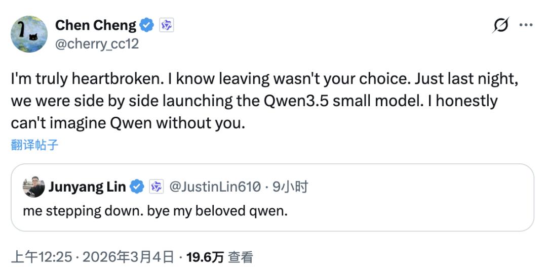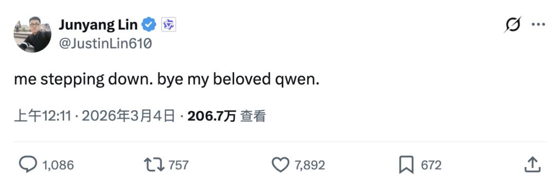 但就在3月4日凌晨,Qwen技术负责人林俊旸突然在社交媒体发布状态:“me stepping down. bye my beloved qwen.”