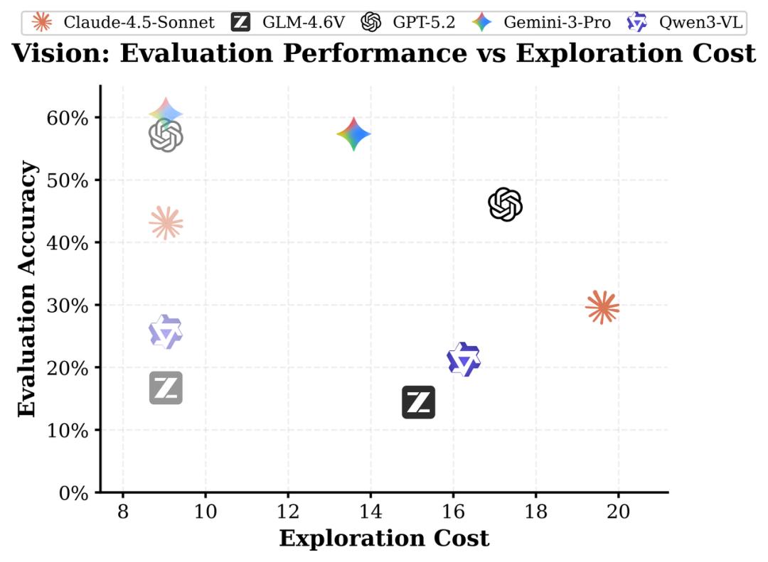 结果令人震惊:GPT-5.2从被动57.1降到主动46.0(视觉世界),Gemini-3 Pro从60.5降到57.3,在效率方面,规则代理仅需约9步即可达到目标覆盖,而基础模型常常需要 14 步以上且信念质量并未提升。模型「探索得多」但「探索得差」,高冗余、低效率。随着环境复杂度增加,这种差距进一步扩大。