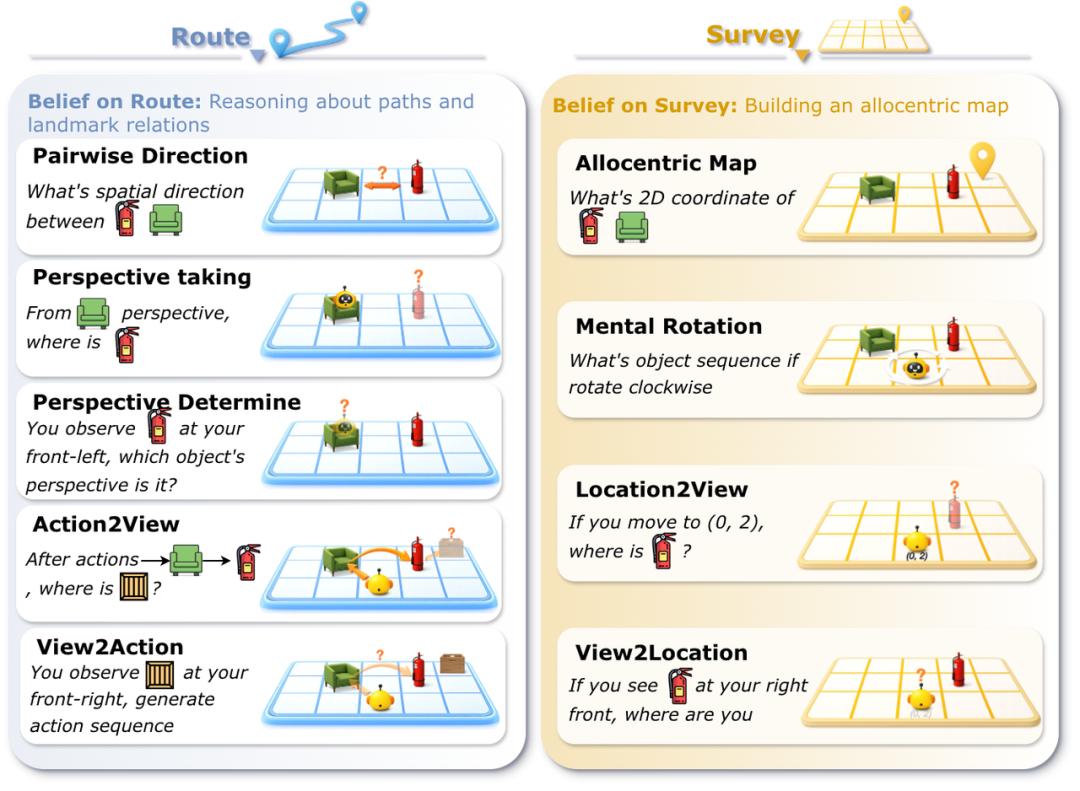 覆盖路径级(Route)(路径推理)和全局级(Survey)(鸟瞰视角地图推理)两个层次,全面评估空间信念的利用价值。