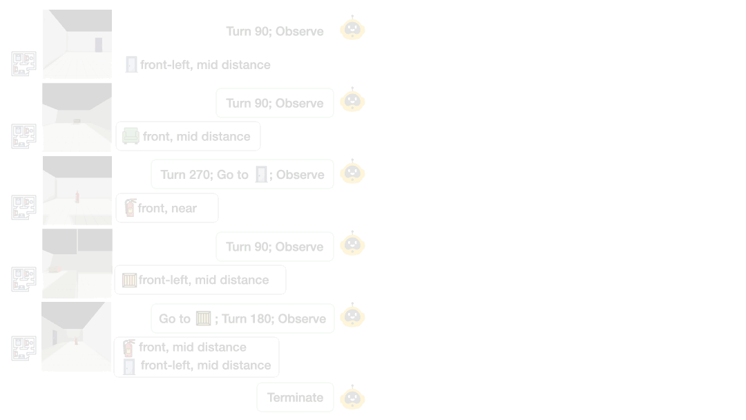 研究人员在程序化生成的多房间室内布局中,提供文本世界(符号化方向/距离)和视觉世界(ThreeDWorld 渲染的第一人称 RGB 图像)两种平行环境。智能体必须自主决定移动、旋转、观察的策略,高效构建空间信念。直觉上你可能会以为这类任务就是「多看看」。但更关键的是,智能体需要用不确定性来驱动行动,去做高效的信息获取。
