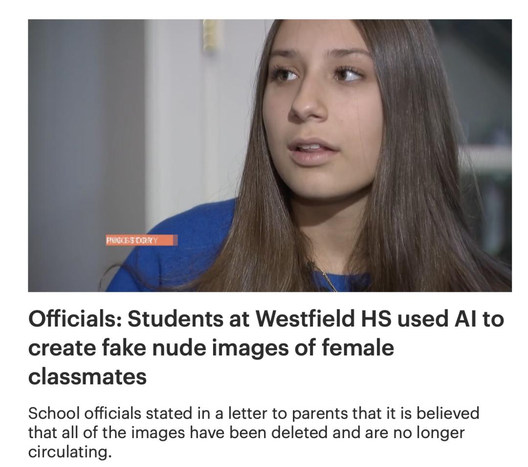 此类事件不胜枚举,比如在新泽西州的韦斯特菲尔德高中,一个典型的美国中产阶级学区,却爆发了震惊全美的丑闻:一群看起来「品学兼优」的男生,利用 AI 生成了多达三十多名女同学的虚假暴露图片照,并在私密群组里像交换棒球卡一样流传。