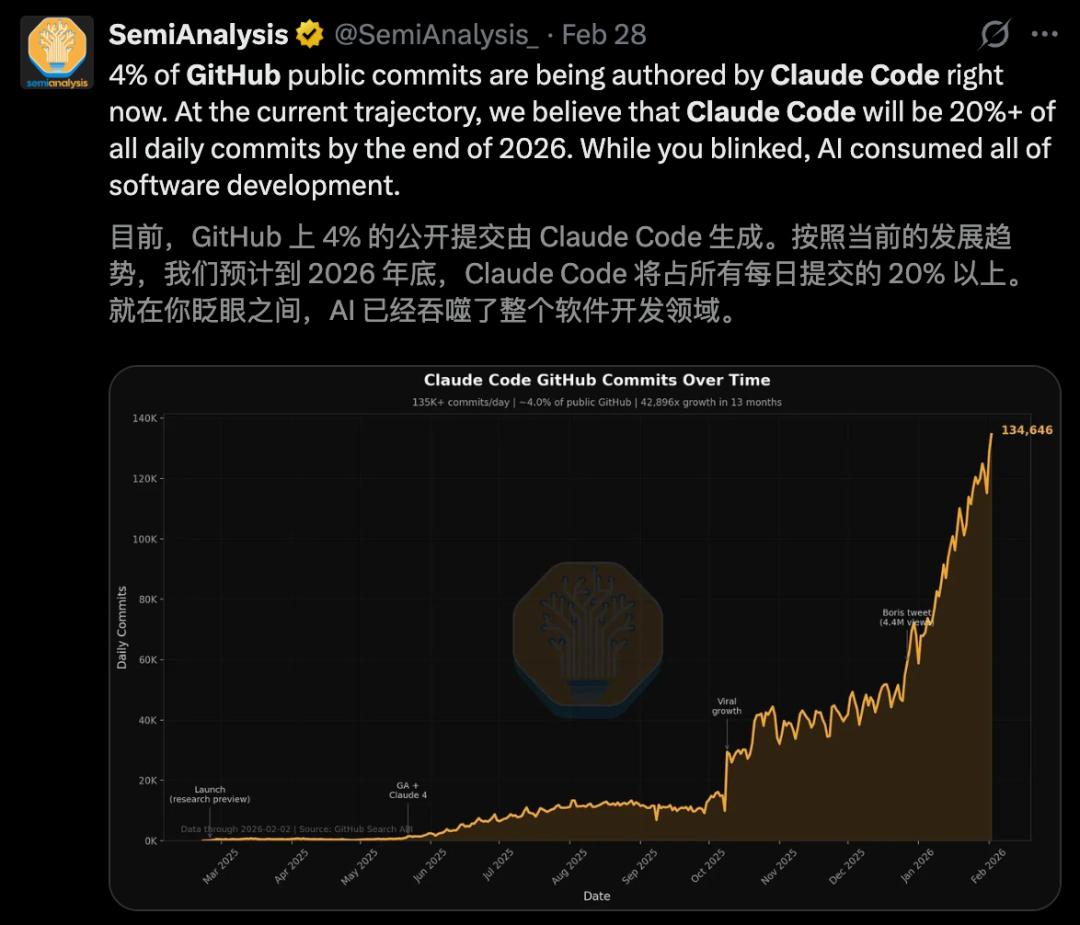 一项惊人的分析显示:全球GitHub上4%的公开代码提交,竟然都是由Claude Code自动生成的,这一比例在一个月内就翻了一番