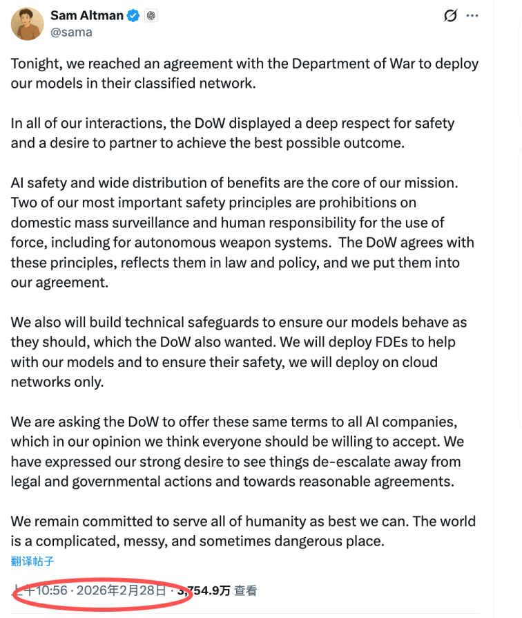然而,当地时间上周五,奥特曼突然在X上公布了和DoW达成协议,将进行机密范畴合作的消息。说白了就是,替代Anthropic。