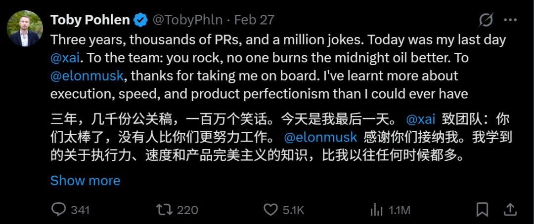 就在杨格之后,xAI两位联合创始人一天之内相继离开(走的还是以吃苦耐劳著称的华人),一线员工集体在X上发“我从xAI离职了”,场面一时颇引人注目。