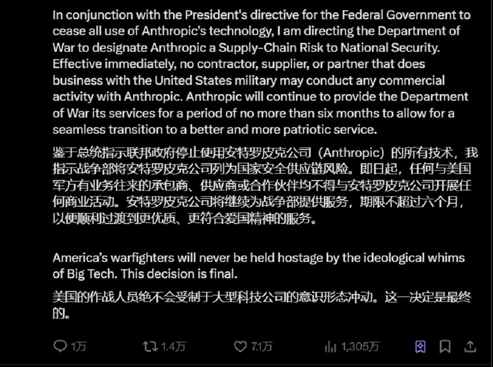 Anthropic的管理层告诉美国国防部,这已经越界了,最终交易告吹。随后,在上周五,美国总统特朗普在社交媒体上宣布封杀Anthropic,美国国防部长Pete Hegseth也于发文称Anthropic构成供应链风险——这种认定通常只会用于美国的对手国家或实体。