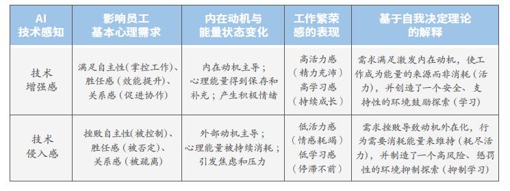 综合来看,在增强感路径下,AI辅助系统为员工提供工具和信息支持,使他们能够更自由地安排工作,完成更高难度任务,并通过良好的人机氛围满足情感需要。这将满足员工对自主性、胜任感和归属感的需求,进而提升工作繁荣感。而侵入感路径下,AI辅助系统可能削减员工对工作的控制权,引发其对技能退化的担忧,减少了员工在组织中的人际连接,满足需求的过程受到干扰。在这种压力下,员工就难以体验到工作中的活力和学习感,工作繁荣感随之下降。表1总结了这两类技术感知对工作繁荣感的影响机制以及基于自我决定理论的解释。