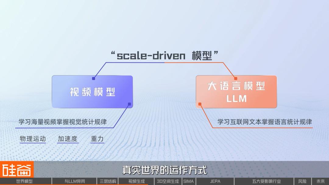 视频生成路线其实和大语言模型很像,两者都是典型“scale-driven(规模驱动)模型”。语言模型通过学习互联网文本掌握语言统计规律,视频模型通过学习海量视频掌握视觉统计规律,区别在于:视频数据天然包含物体运动、加速度、重力等物理特征,因此视频模型能更直接地看到真实世界的运作方式。
