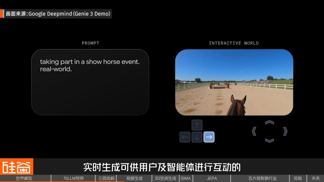 Genie 3的这种可控性,意味着模型内部不再只是预测下一帧是什么,而是已经在模拟“未来的世界状态”。它让视频生成从“播放”走向“交互”,开始从“电影式生成”走向“游戏式模拟”,更接近一个真正的“世界引擎”,也更接近智能体将来需要使用的环境。