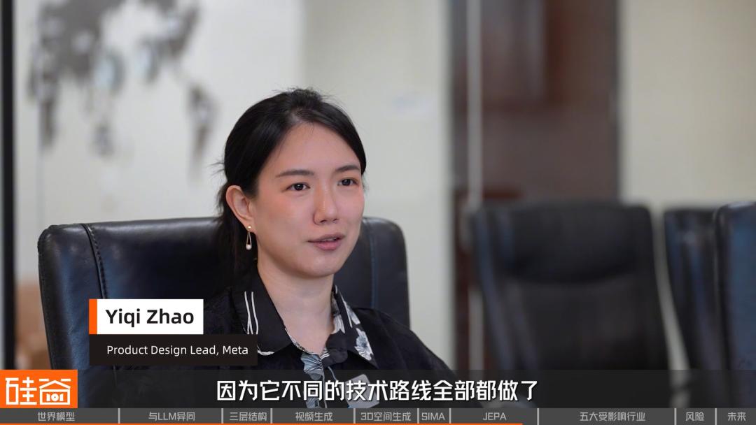 Yiqi表示,因为目前世界模型在落地层面还在早期阶段,并没有看到哪一条路线具体的商业应用形式,所以包括Meta在内的大厂们,实际是在各个路线上都在做布局和研究。