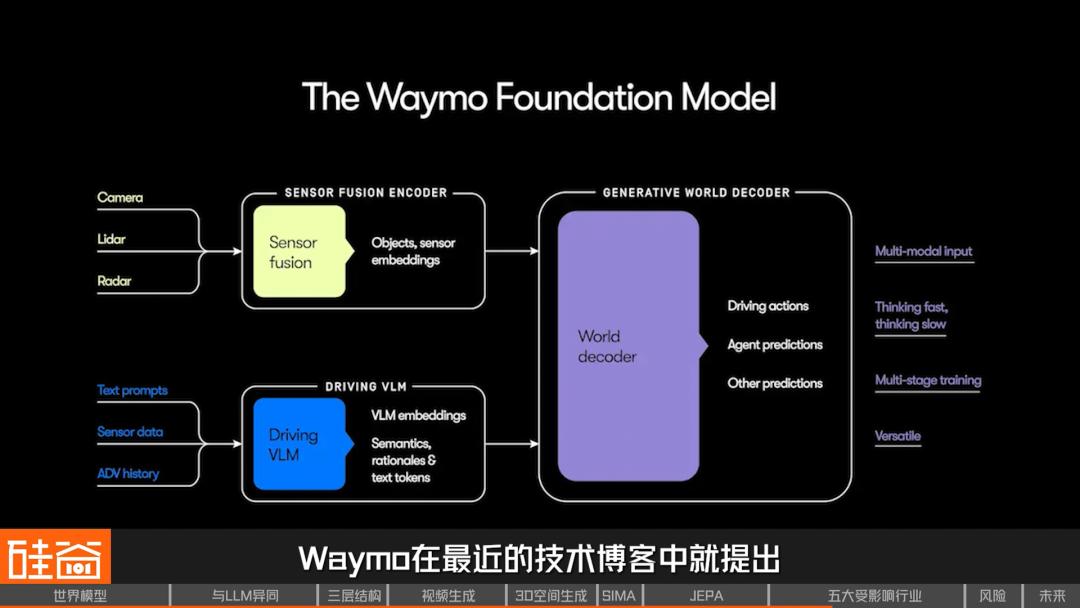 而这正是世界模型开始真正进入工程体系的地方。比如Waymo在最近的技术博客中提出,他们正在将自动驾驶系统的核心,构建为一个Foundation model(基础模型),它采用了“分段式端到端”的架构,内部可以进行端到端训练和反向传播,同时又保留了对世界的结构化表达。这个模型不只是完成单一任务,而是学习“世界如何运转”,它被要求输出物体、语义属性和道路结构等中间表征,让系统在出错时,能够定位问题出在世界理解的哪一层。
