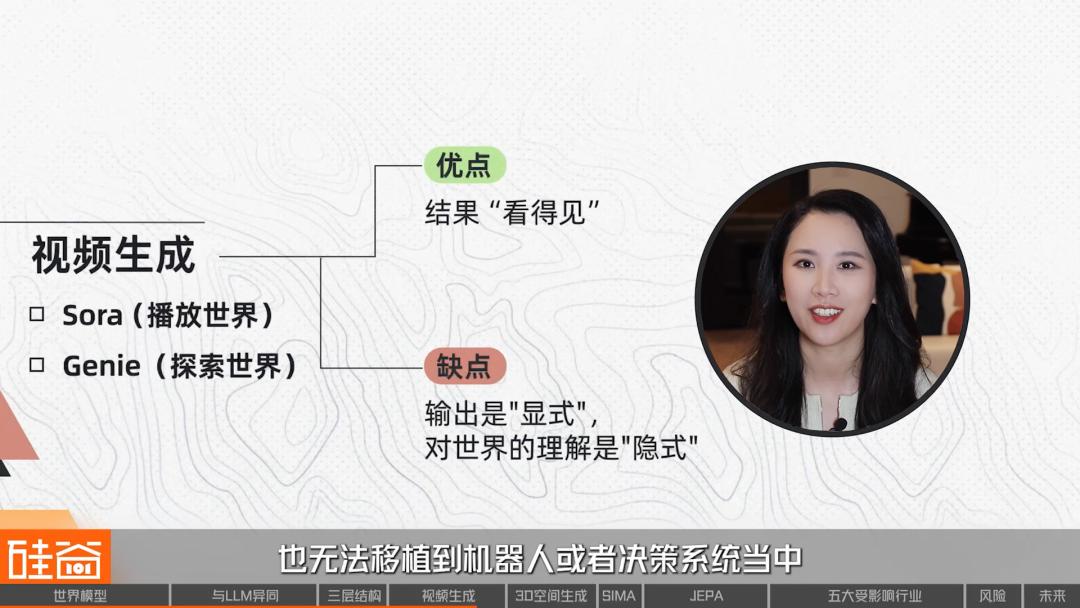 但视频生成的局限也同样明显,最重要的一点是,虽然它的输出是“显式”的,但内部对世界的理解是“隐式”的,我们无法直接读取,也无法将能力直接移植到机器人或决策系统中。