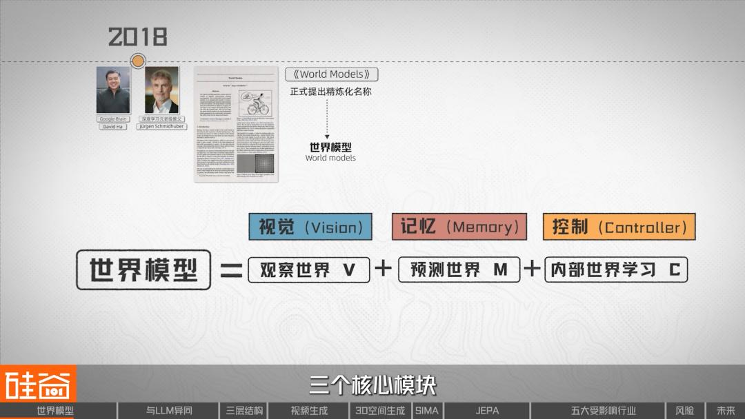 在此后在很长一段时间里,世界模型更多停留在偏理论、偏算法的层面,直到深度学习和表示学习逐渐成熟。2018年,Google Brain的David Ha与深度学习元老级教父Jürgen Schmidhuber共同发表了论文《World Models》。这篇论文正式提出了“世界模型”(World models)这个精炼化的名称,同时还给出了一个比较简洁的世界模型理解框架: