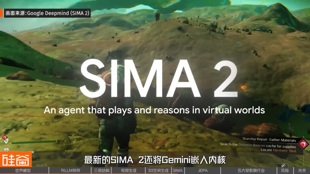 而SIMA的训练方式就是把AI放进很多不同类型的游戏环境里去“练级”。最新的SIMA 2还将Gemini嵌入内核,并首次使用Genie 3生成的游戏世界进行了训练。