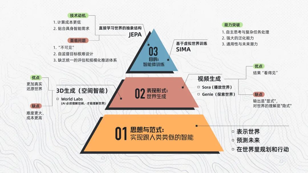 到这里,我们把世界模型最核心的几条技术路线都梳理了一遍:有人用视频把世界“画”出来;有人用 3D 把世界“搭”出来;有人在虚拟世界里训练行动智能;也有人干脆不画世界,想让AI直接学习世界的结构。