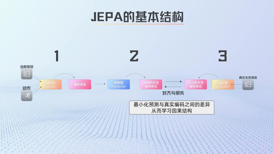 JEPA的基本结构可以拆成三件事:首先,用Encoder(编码器)将视觉和动作压缩成抽象表征,然后用Predictor(预测器)预测这些抽象状态在未来如何变化,最后将预测结果与真实未来状态的编码进行对齐,让模型学会捕捉世界的关键因果结构。