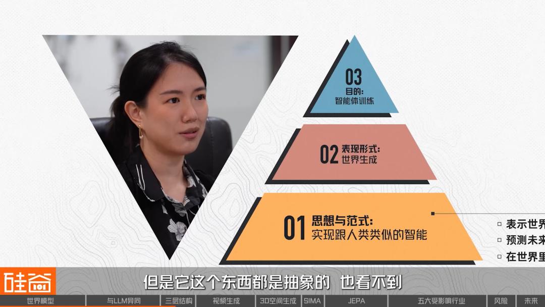 关于这个问题,我们的嘉宾Yiqi结合世界模型的理论知识以及她在Meta的一些实践观察,在采访中提出了一个我们认为非常有帮助于大家理解的框架,就是把整个世界模型领域拆解成“三层结构”,在这个架构中: