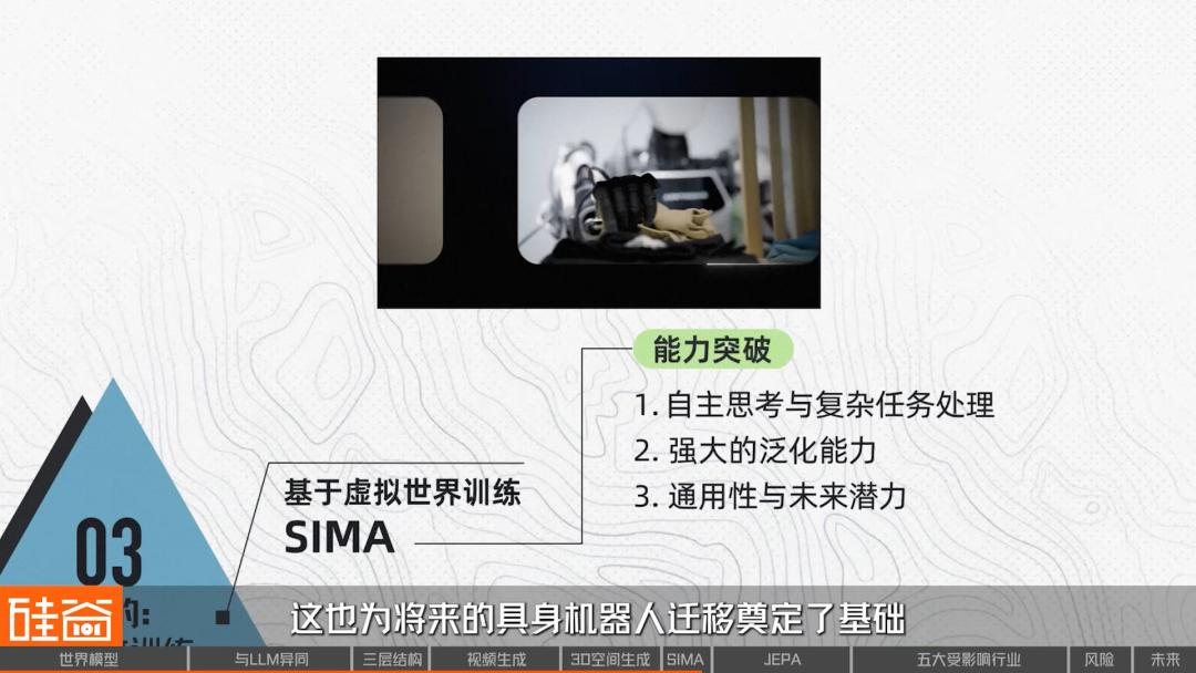 第一条路线,就是直接把世界生成模型当成“训练环境”,让AI在虚拟生成的世界里不断去犯错、探索、总结,最终学会一套可以迁移到真实世界的能力,这一类的代表是Google SIMA。