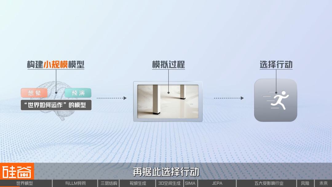 它是把世界抽象到一个潜在的、被压缩过的空间里,在这个潜在空间里,你能够通过学到的物理规律,去做对未来的预测,形成一个对真实世界的模拟器。相当于它是一个模拟系统,有点像是一个缩小的平行宇宙。这感觉就像如果你有一个真正的AI大脑,它就拥有自己的AI世界观。因为可以做预测,所以就可以去做未来的推演,就可以做决策。