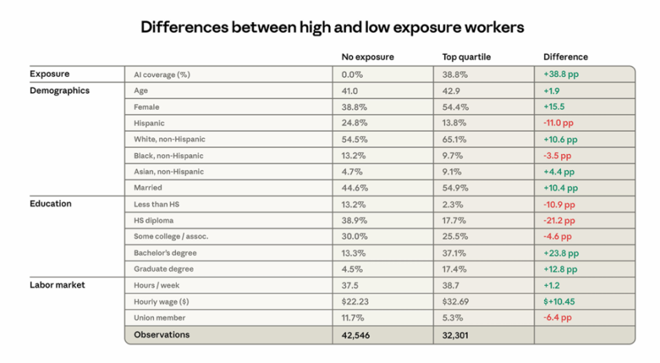 但根据 2022 年秋季美国当前人口调查(CPS)数据,Anthropic 的研究发现,处于 AI 暴露度最高 25% 区间的劳动者呈现出不同特征:平均年龄较大,收入比低暴露群体高 47%,受教育程度也更高。在低暴露群体中,拥有研究生学历的比例为 4.5%,而在高暴露群体中这一比例为 17.4%。
