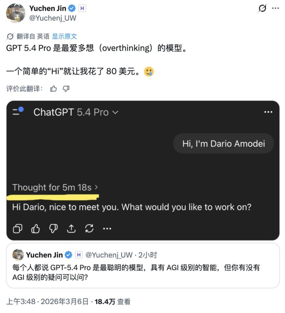 而且这个趋势完全没有停下来的倾向。比如新发布的GPT 5.4 Pro花了5分18s,80美元,来回答一个Hi的招呼。
