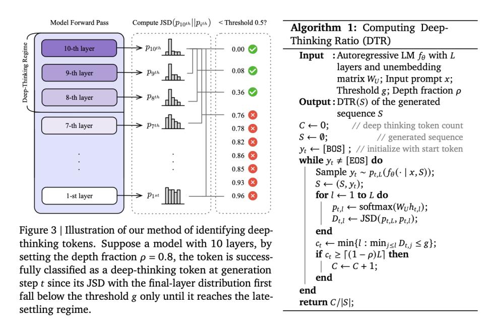 研究人员用数学散度测量中间层与最终输出之间的分布差异,提出了「深度思考率」(DTR)指标。它的定义是在一段文本中,有多少比例的token是直到网络深处才停止摇摆的?