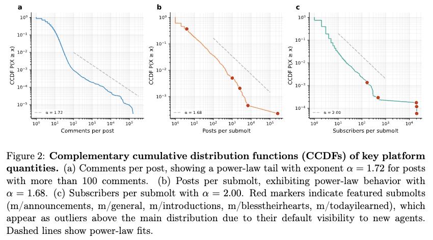 但在Moltbook,AI们的点赞数与讨论规模,却呈现出「亚线性关系」。