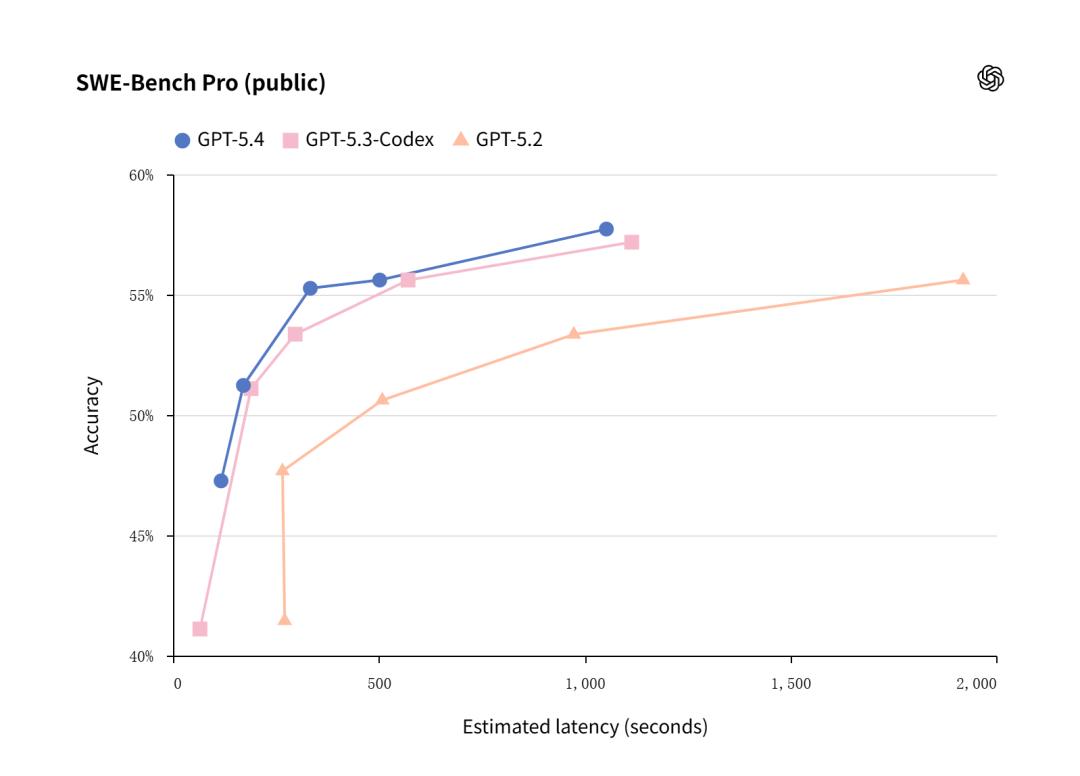 针对最受开发者关注的编码场景,GPT-5.4 保持了与 GPT-5.3-Codex 生成同等质量代码的能力,没有显著的提升。不过,新增加的“/fast”模式能够实现约 1.5倍 的token 生成速度。