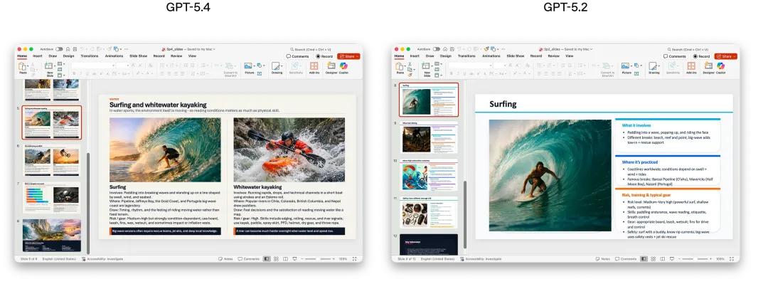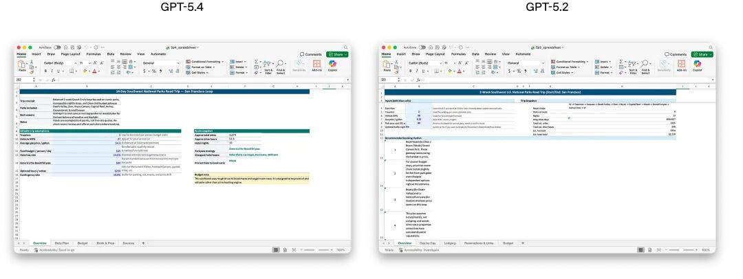为了更好地让 GPT-5.4 融入人们的实际工作场景,OpenAI 在官方介绍中直观展现了新版本模型在电子表格、文档和幻灯片三个场景的专业级表现:
