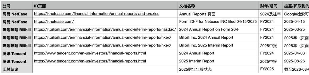又比如,我让他收集一下网易、B站、腾讯等上市公司IR网站2025年年报,很快便给了我梳理一份IR页面统计。不过经过笔者甄别后,大多给出的链接是2024年或25年中的IR链接,在时效性上稍差,想要达到可用的地步,可能还需要进行精教。看到这里,我觉得自己暂时不会失业。