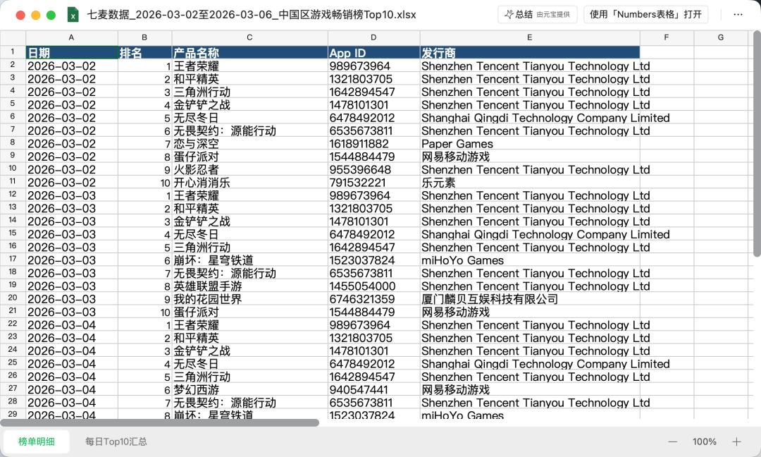 在附着后,再次让它帮我拉取七麦数据 3.2-3.6 畅销榜表现,五分钟后,电脑上多了一份名为“七麦数据_2026-03-02至2026-03-06_中国区游戏畅销榜Top10”的文件。除了游戏名、排名外,甚至连 App ID、发行商等信息也帮我整理好了。