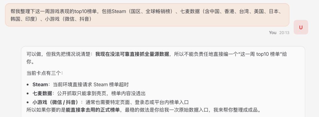 在装好 OpenClaw 的第一件事,就是让它帮从七麦数据上整理这周国内游戏畅销榜 Top10 的产品。但很快就遇到了第一个麻烦。