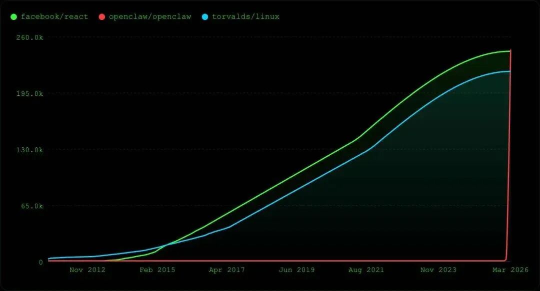 在 GitHub上,OpenClaw 的 Star 已经超越 React、linux 两大巨头。最右边红色拔地而起的不是纵坐标,而是 OpenClaw(图片来源微信公众号“数字生命卡兹克”)