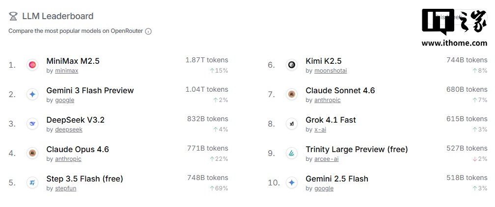 具体排名方面,MiniMax 旗下的 M2.5 模型以 1.87 万亿 Token 的周调用量蝉联全球榜首,环比增长 15%。DeepSeek V3.2 以 0.83 万亿 Token 位列第三,周调用量小幅上涨 4%。值得注意的是,阶跃星辰的 Step 3.5 Flash 表现尤为亮眼,周调用量达 0.75 万亿 Token,环比激增 69%,成功跻身全球第五。