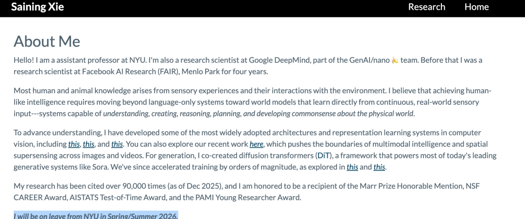在他加入 AMI 消息曝光之前,他的个人网站上有一行字:「2026年春夏学期将休假」。