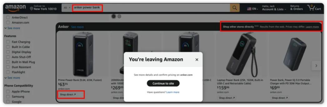 二、“接入”独立站,推出“Shop Direct”(直接购买)功能,让消费者在站内搜索、购买到“在亚马逊暂未上架、但独立站有售”的商品,以应对ChatGPT接入沃尔玛、Etsy之后商品丰富度大增的竞争局面。