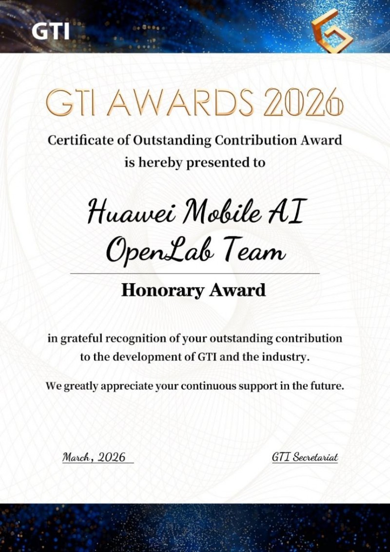 在MWC26 巴塞罗那期间,华为Mobile AI OpenLab团队凭借在移动AI领域的前沿探索与产业协同创新成果,荣获GTI Awards 2026“杰出贡献荣誉奖”。该奖项是GTI对华为在移动AI技术研发、网络标准构建、产业生态合作等方面突出贡献的高度认可,彰显了华为在推动移动AI与通信技术融合发展中的行业引领地位。