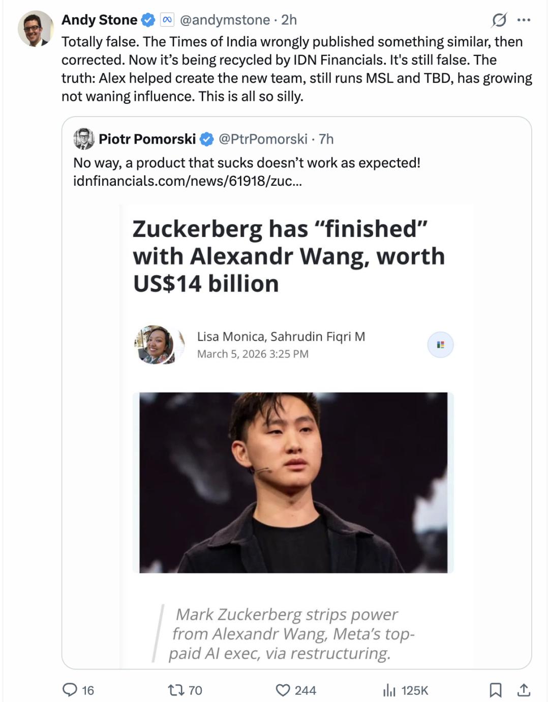 而就在前后脚的功夫,Meta发言人Andy Stone也在X上发文辟谣,否认了最近不断发酵的“亚历山大王出走”的传闻。
