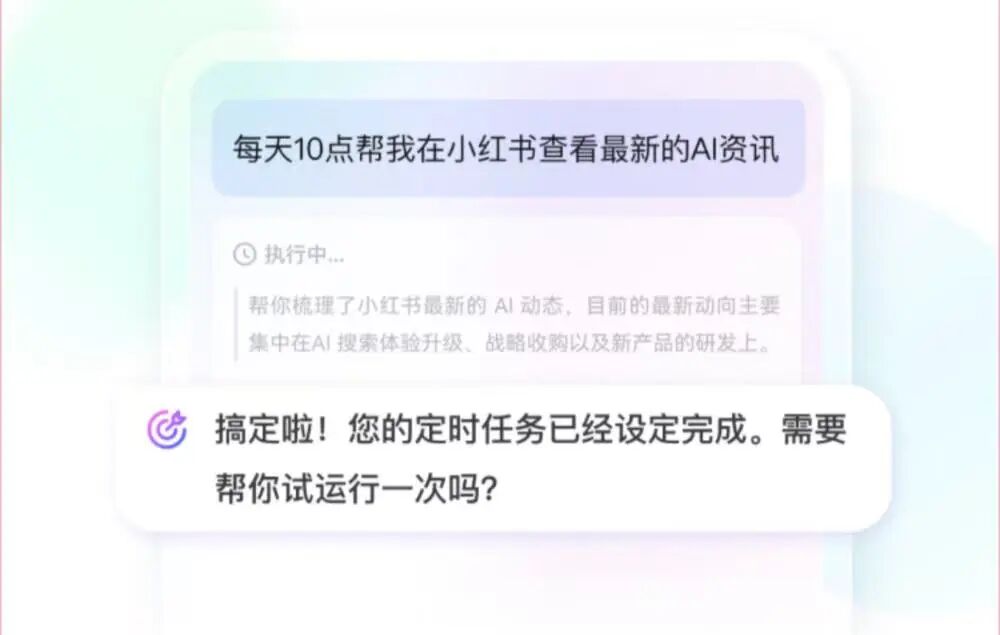 这种能力也延伸到了信息整理场景。用户可以直接提出“每天10点帮我在小红书查看最新的AI资讯”,系统则会将这一需求设为定时任务,并在后续自动执行。