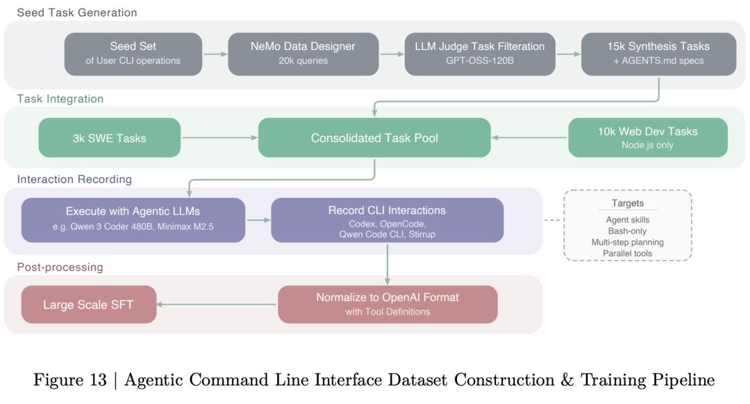 SFT阶段,训练了超过700万样本、800亿token。数据混合中,Agent相关任务占比高达36%,远超对话(23%)和推理(31%)。