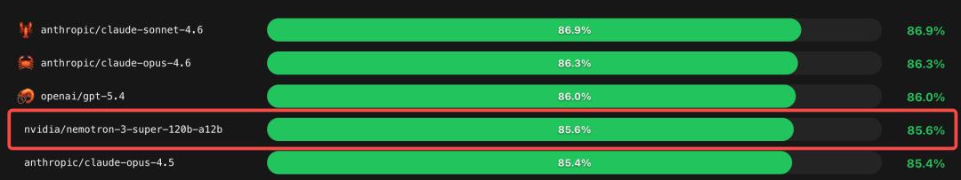 在Pinchbench基准上,Nemotron 3 Super一骑绝尘,稳坐开源第一。
