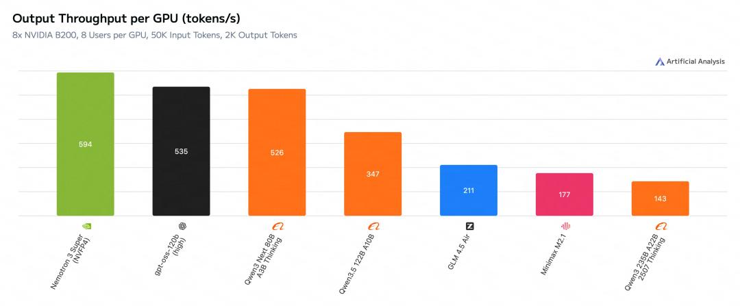 而且,在输入序列长度为8k、输出序列长度为64k时,它的吞吐量分别比GPT-OSS-120B和Qwen3.5-122B高出多达2.2倍和7.5倍。