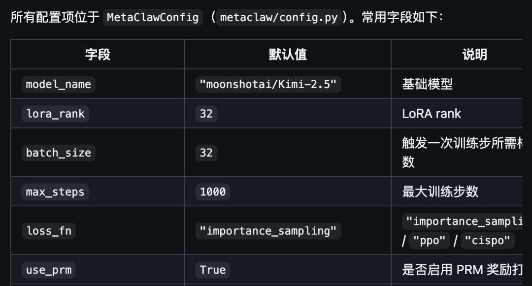 所有配置项都集中在MetaClawConfig中,包括模型选择、LoRA参数、批次大小、训练步数、损失函数类型等,一目了然。